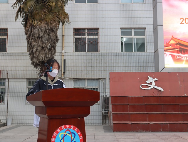 升旗完畢,商務21251班藺嬌嬌發表國旗下講話,她用鏗鏘有力的聲音代表全體學生表態,新學期要堅定理想信念,規范自身言行,做文明的新時代好青年;要快速、穩步進入學習狀態,確立新目標,制定新規劃,通過不懈努力實現美好夢想。