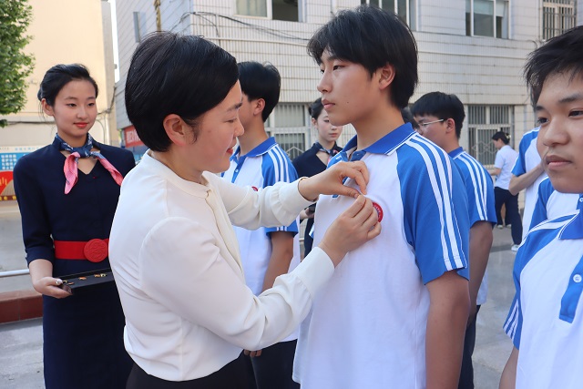 校長魏萍為新團員佩戴團徽