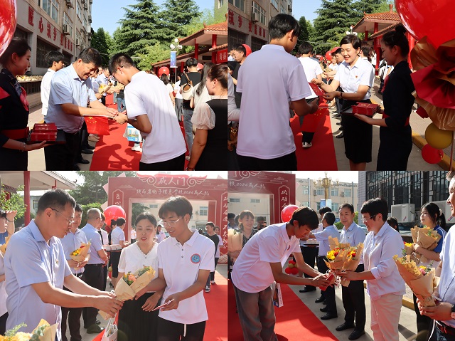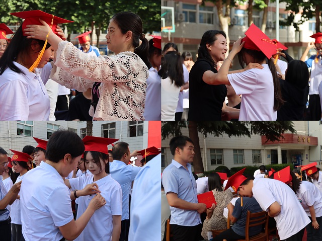 校領(lǐng)導(dǎo)、班主任和家長(zhǎng)為學(xué)生佩戴成人禮帽和徽章