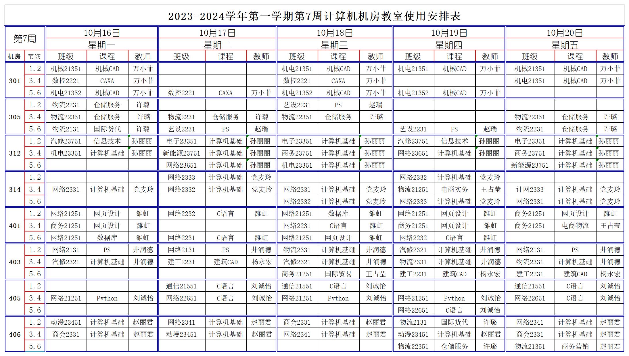 陜西電子信息學校2023-2024第一學期第7周機房排課表