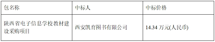 本招標項目陜西省電子信息學校教材建設采購項目(招標項目編號:【KRDL】K1-2404043),確定001陜西省電子信息學校教材建設采購項目的中標人如下: